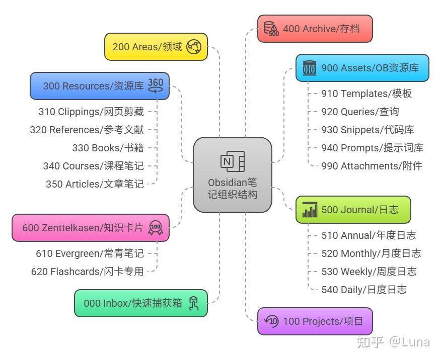 └── 990 Attachments/ 附件(图片、笔记关联文件)0000 Inbox/: 快速捕捉临时信息和想法的“收件箱”。100 Projects/: 管理有明确目标和截止日期的项目。200 Areas/: 组织需要长期关注的责任领域或进一步萃取的知识。300 Resources/: 存放各种类型的信息和参考资料和相关的学习笔记。根据《有序》一书的观点,增设了杂物箱400 Archive/: 存放已完成或不再活跃的内容。500 Journal/: 按时间维度组织年度、月度、周度、每日日志,用于规划和回顾。600 Zenttelkasen/: 知识卡片用于知识转化。900 Assets/: 存放所有笔记运行所需资源。